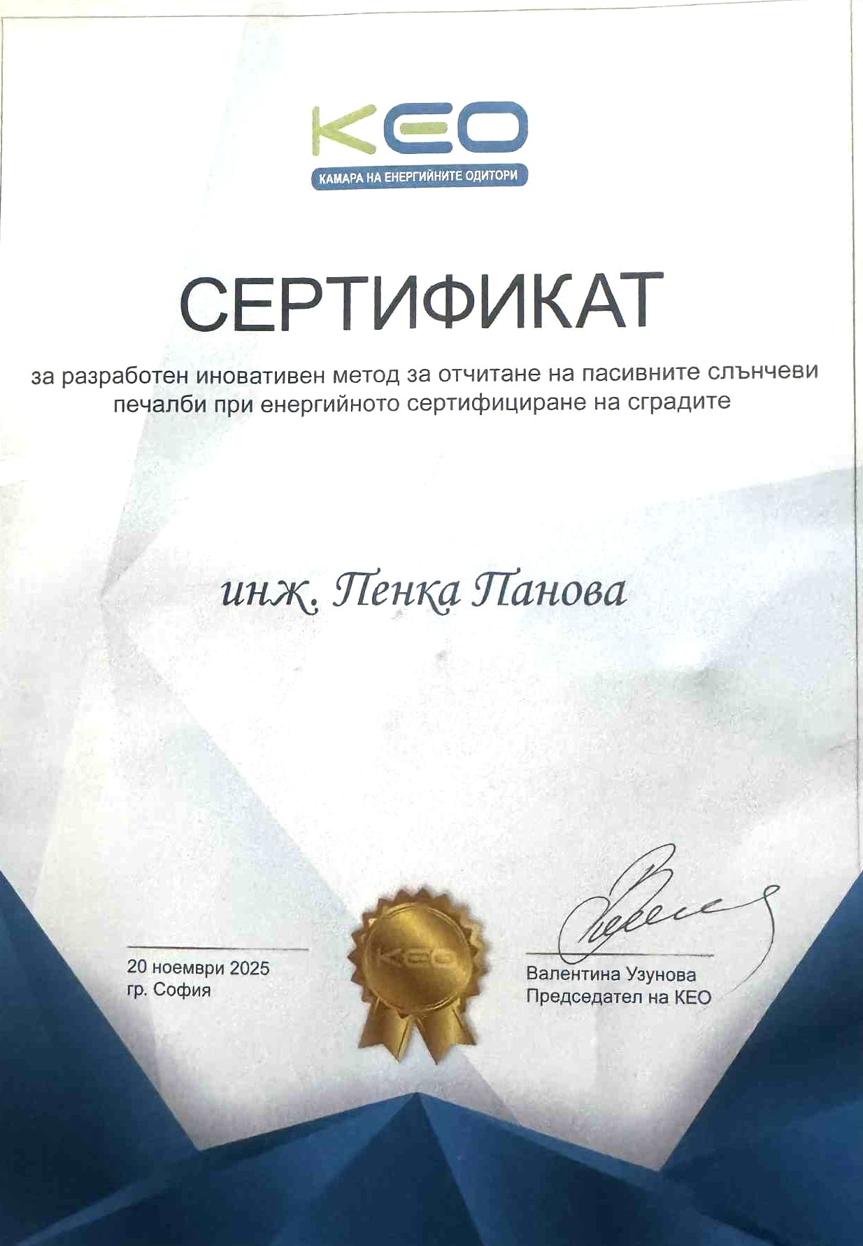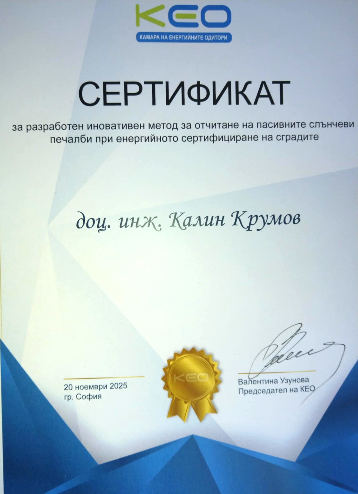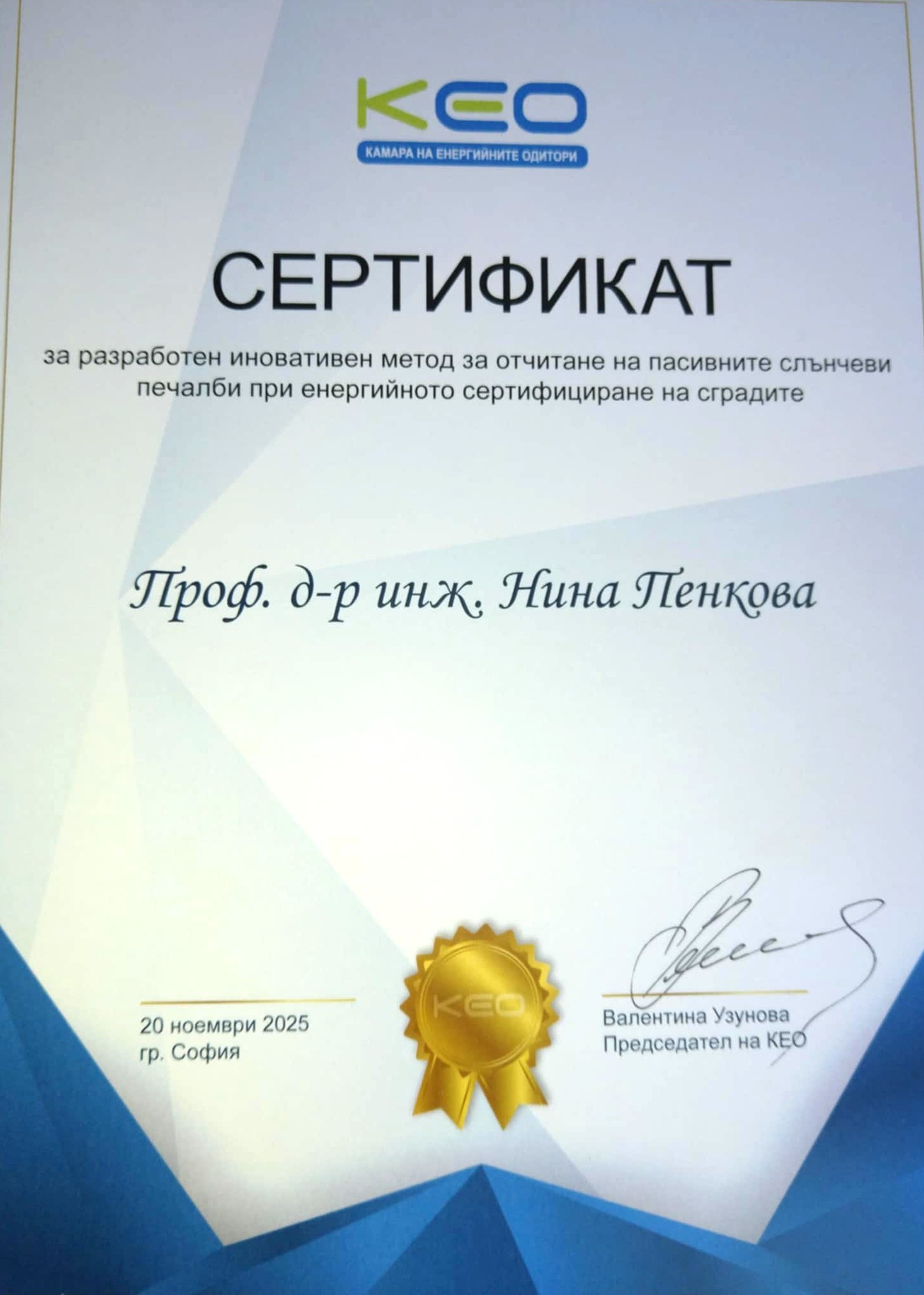 Екип от Технология на силикатите в ХТМУ, включващ проф. д-р инж. Нина Пенкова, доц. д-р инж. Калин Крумов и докторант инж. Пенка Панова, получи награда за Разработен иновативен метод за отчитане на пасивните слънчеви печалби при енергийното сертифициране на сградите.
