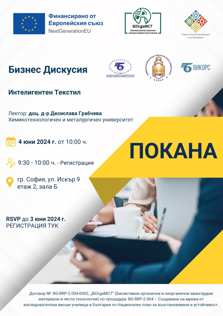 На 4 юни 2024 (вторник) от 10:00ч. в сградата на БТПП, зала Б, ул. “Искър“ 9, гр. София, ще се проведе бизнес дискусия на тема „Интелигентен текстил“ . Организирането на дискусията е възложено и се финансира от с Химикотехнологичния и металургичен университет във връзка изпълнението на Договор №: BG-RRP-2.004-0002-C03, „BiOrgaMCT“ (Биоактивни органични и неорганични авангардни материали и чисти технологии) по процедура: BG-RRP-2.004 – Създаване на мрежа от изследователски висши училища в България по Национален план за възстановяване и устойчивост.